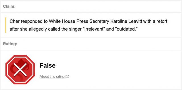 Snopes: Rumor has it Cher responded to Karoline Leavitt calling her 'irrelevant.' Here's the truth tl;dr: Fake.