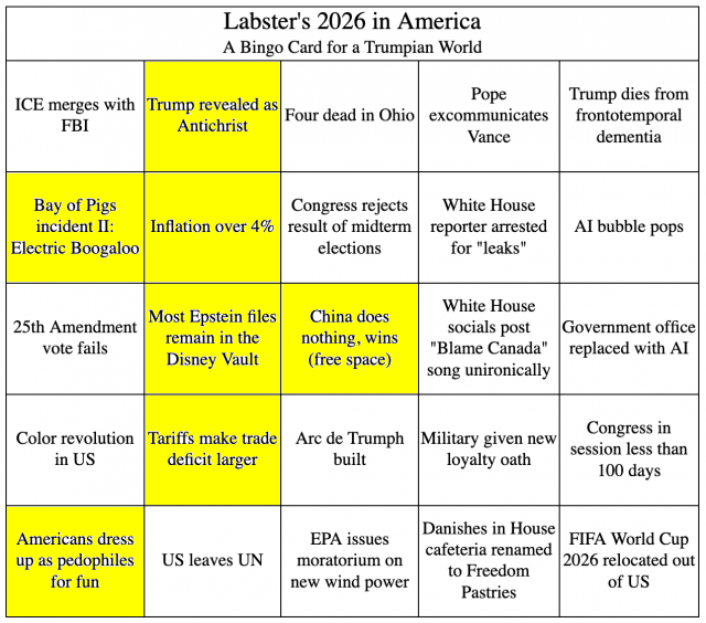 (04-13-2026, 05:01 AM)Labster Wrote:(04-13-2026, 12:29 AM)Jinx999 Wrote: Okay. Did anyone have "feud with pope" on their bingo cards?
